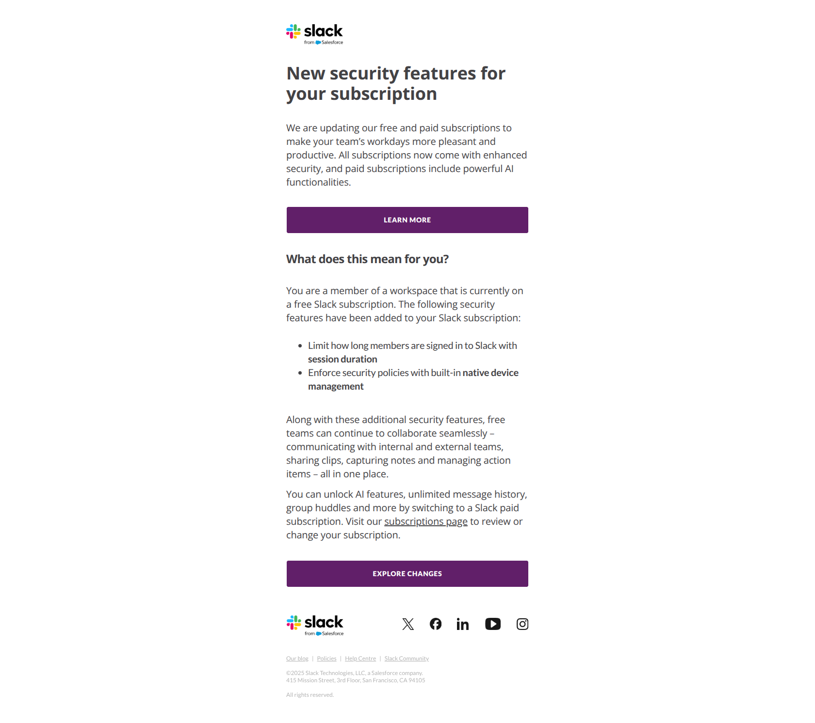 <!DOCTYPE html PUBLIC "-//W3C//DTD XHTML 1.0 Strict//EN" "http://www.w3.org/TR/xhtml1/DTD/xhtml1-strict.dtd"><html xmlns="http://www.w3.org/1999/xhtml"><head><meta http-equiv="Content-Type" content="text/html; charset=utf-8"><meta name="viewport" content="width=device-width, initial-scale=1.0"><link href="https://fonts.googleapis.com/css?family=Lato:400,700,900" rel="stylesheet"><title> Slack’s free subscription will now include additional security features </title><style type="text/css">/* Global Resets */ body, .background_main, p, table, td, div { font-family: 'Lato', 'Helvetica Neue', Helvetica, Arial, sans-serif; } img { border: none; -ms-interpolation-mode: bicubic; max-width: 100%; } p {padding-bottom: 2px;} body { background: #fff; font-size: 17px; line-height: 24px; margin: 0; padding: 0; -ms-text-size-adjust: 100%; -webkit-text-size-adjust: 100%; } table { border-collapse: collapse; mso-table-lspace: 0pt; mso-table-rspace: 0pt; width: 100%; } td { font-size: 17px; line-height: 24px; vertical-align: top; } /* Footer */ .email_footer td, .email_footer p, .email_footer span { font-size: 15px; text-align: center; color: #1d1c1d; } .email_footer a { text-decoration: underline; } .email_footer td {padding-top: 20px;} .footer_logo { width: 40px; height: 40px; padding-bottom: 20px; } .footer_title { font-weight: 900; } .preheader { display: none; mso-hide: all; } /* Typography */ h1, h2, h3, h4 { color: #1d1c1d; font-weight: 700; margin: 0; margin-bottom: 12px; } h1 { font-size: 36px; line-height: 42px; letter-spacing: -.25px; margin-bottom: 28px; text-align: left; word-break: break-word; } h2 { font-size: 24px; line-height: 32px; letter-spacing: -0.75px; margin-bottom: 28px; text-align: left; } h3 { font-size: 18px; line-height: 24px; letter-spacing: 0px; margin-bottom: 0px; } p, ul, ol { font-size: 17px; line-height: 24px; font-weight: normal; margin: 0; margin-bottom: 15px; } ul, ol { padding-left: 40px; } p li, ul li, ol li { list-style-position: outside; margin-left: 5px; } p { font-size: 16px; letter-spacing: -0.2px; } a { color: #1264a3; text-decoration: underline!important; } a:hover {text-decoration: underline;} .button_link::after { position: absolute; content: ''; top: 0; right: 0; bottom: 0; left: 0; border-radius: 4px; } .action_section_workspace_url a[href] { color: #454447; } .action_section_workspace_url:hover { color: #1264A3 !important; } .button_link:hover::after { box-shadow: inset 0 -2px #237c4a; } .button_link.is_secondary:hover::after { box-shadow: none; } .button_link.plum:hover { background-color: #4a154b !important; border-color: #4a154b !important; } .button_link_wrapper.plum:hover { background-color: #4a154b !important; } .button_link.plum:hover::after { box-shadow: none; } .preview_text { color: transparent; display: none; height: 0; max-height: 0; max-width: 0; opacity: 0; overflow: hidden; mso-hide: all; visibility: hidden; width: 0; font-size: 1px; line-height:1px; } .preview_text a { color: #3AA3E3 !important; font-weight: bold; } .sm_visible { display: none; } .footer_padding { padding: 0 50px; } table[class="background_main"] .social_icon_margin { margin-left: 32px !important; } /* Responsive and Mobile Friendly Styles */ /* Yahoo Mail has a history of rendering all media query styles with class selectors unless class is used as an attribute */ @media only screen and (max-width: 600px) { table[class="background_main"] .sm_full_width { width: 100% !important; } table[class="background_main"] .sm_90_percent_width { width: 90% !important; padding: 16px !important; text-align: center !important; float: none !important; } table[class="background_main"] .sm_side_padding { padding-right: 8px !important; padding-left: 8px !important; float: none !important; } table[class="background_main"] .sm_small_top_padding { padding-top: 8px !important; } table[class="background_main"] .sm_top_padding { padding-top: 16px !important; } table[class="background_main"] .sm_auto_width { width: auto !important; } table[class="background_main"] .sm_auto_height { height: auto !important; } table[class="background_main"] .sm_border_box { box-sizing: border-box !important; } table[class="background_main"] .sm_block { display: block !important; } table[class="background_main"] .sm_inline_block { display: inline-block !important; } table[class="background_main"] .sm_table { display: table !important; } table[class="background_main"] .sm_no_side_padding { padding-right: 0 !important; padding-left: 0 !important; } table[class="background_main"] .sm_no_border_radius { border-radius: 0 !important; } table[class="background_main"] .sm_no_padding { padding-right: 0 !important; padding-left: 0 !important; } table[class="background_main"] .sm_os_icons_height { /* this is to make the parent element the same height as the inline-block img inside */ height: 44px; } table[class="background_main"] .small_icon { width: 20px !important; height: 20px !important; } table[class="background_main"] .social_icon_margin { margin-left: 20px !important; } table[class="background_main"] .slack_logo_small_icon { width: 80px !important; } table[class="background_main"] .slack_logo_small_icon img { height: 24px !important; } .social_img_bottom_margin { /*this class is for social_user_outreach email only*/ margin-bottom: 20px !important; } .social_p_bottom_margin { /*this class is for social_user_outreach email only*/ margin-bottom: 40px !important; } /* Common responsive styles for new email design templates #feat-activation-email-audit */ .sm_hidden { display: none!important; } .sm_visible { display: inline-block!important; } h1 { font-size: 24px!important; line-height: 30px!important; margin-bottom: 20px!important; word-break: break-word; } h2 { font-size: 16px!important; line-height: 23px!important; margin-bottom: 10px!important; } h3 { font-size: 14px!important; line-height: 20px!important; } .hero_paragraph, .bulleted_list { font-size: 14px!important; line-height: 19px!important; margin-bottom: 20px!imp