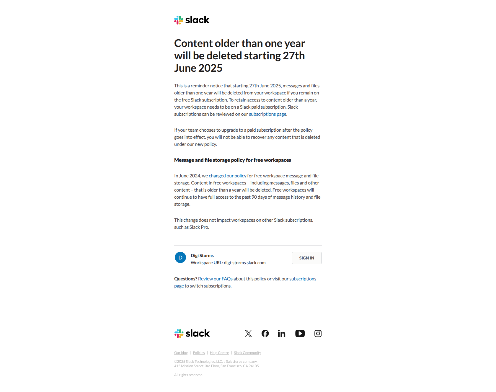 <!DOCTYPE html PUBLIC "-//W3C//DTD XHTML 1.0 Strict//EN" "http://www.w3.org/TR/xhtml1/DTD/xhtml1-strict.dtd"><html xmlns="http://www.w3.org/1999/xhtml"><head><meta http-equiv="Content-Type" content="text/html; charset=utf-8"><meta name="viewport" content="width=device-width, initial-scale=1.0"><link href="https://fonts.googleapis.com/css?family=Lato:400,700,900" rel="stylesheet"><title>Reminder: Content older than one year will be deleted from your free workspace starting 27th June 2025</title><style type="text/css">/* Global Resets */ body, .background_main, p, table, td, div { font-family: 'Lato', 'Helvetica Neue', Helvetica, Arial, sans-serif; } img { border: none; -ms-interpolation-mode: bicubic; max-width: 100%; } p {padding-bottom: 2px;} body { background: #fff; font-size: 17px; line-height: 24px; margin: 0; padding: 0; -ms-text-size-adjust: 100%; -webkit-text-size-adjust: 100%; } table { border-collapse: collapse; mso-table-lspace: 0pt; mso-table-rspace: 0pt; width: 100%; } td { font-size: 17px; line-height: 24px; vertical-align: top; } /* Footer */ .email_footer td, .email_footer p, .email_footer span { font-size: 15px; text-align: center; color: #1d1c1d; } .email_footer a { text-decoration: underline; } .email_footer td {padding-top: 20px;} .footer_logo { width: 40px; height: 40px; padding-bottom: 20px; } .footer_title { font-weight: 900; } .preheader { display: none; mso-hide: all; } /* Typography */ h1, h2, h3, h4 { color: #1d1c1d; font-weight: 700; margin: 0; margin-bottom: 12px; } h1 { font-size: 36px; line-height: 42px; letter-spacing: -.25px; margin-bottom: 28px; text-align: left; word-break: break-word; } h2 { font-size: 24px; line-height: 32px; letter-spacing: -0.75px; margin-bottom: 28px; text-align: left; } h3 { font-size: 18px; line-height: 24px; letter-spacing: 0px; margin-bottom: 0px; } p, ul, ol { font-size: 17px; line-height: 24px; font-weight: normal; margin: 0; margin-bottom: 15px; } ul, ol { padding-left: 40px; } p li, ul li, ol li { list-style-position: outside; margin-left: 5px; } p { font-size: 16px; letter-spacing: -0.2px; } a { color: #1264a3; text-decoration: underline!important; } a:hover {text-decoration: underline;} .button_link::after { position: absolute; content: ''; top: 0; right: 0; bottom: 0; left: 0; border-radius: 4px; } .action_section_workspace_url a[href] { color: #454447; } .action_section_workspace_url:hover { color: #1264A3 !important; } .button_link:hover::after { box-shadow: inset 0 -2px #237c4a; } .button_link.is_secondary:hover::after { box-shadow: none; } .button_link.plum:hover { background-color: #4a154b !important; border-color: #4a154b !important; } .button_link_wrapper.plum:hover { background-color: #4a154b !important; } .button_link.plum:hover::after { box-shadow: none; } .preview_text { color: transparent; display: none; height: 0; max-height: 0; max-width: 0; opacity: 0; overflow: hidden; mso-hide: all; visibility: hidden; width: 0; font-size: 1px; line-height:1px; } .preview_text a { color: #3AA3E3 !important; font-weight: bold; } .sm_visible { display: none; } .footer_padding { padding: 0 50px; } table[class="background_main"] .social_icon_margin { margin-left: 32px !important; } /* Responsive and Mobile Friendly Styles */ /* Yahoo Mail has a history of rendering all media query styles with class selectors unless class is used as an attribute */ @media only screen and (max-width: 600px) { table[class="background_main"] .sm_full_width { width: 100% !important; } table[class="background_main"] .sm_90_percent_width { width: 90% !important; padding: 16px !important; text-align: center !important; float: none !important; } table[class="background_main"] .sm_side_padding { padding-right: 8px !important; padding-left: 8px !important; float: none !important; } table[class="background_main"] .sm_small_top_padding { padding-top: 8px !important; } table[class="background_main"] .sm_top_padding { padding-top: 16px !important; } table[class="background_main"] .sm_auto_width { width: auto !important; } table[class="background_main"] .sm_auto_height { height: auto !important; } table[class="background_main"] .sm_border_box { box-sizing: border-box !important; } table[class="background_main"] .sm_block { display: block !important; } table[class="background_main"] .sm_inline_block { display: inline-block !important; } table[class="background_main"] .sm_table { display: table !important; } table[class="background_main"] .sm_no_side_padding { padding-right: 0 !important; padding-left: 0 !important; } table[class="background_main"] .sm_no_border_radius { border-radius: 0 !important; } table[class="background_main"] .sm_no_padding { padding-right: 0 !important; padding-left: 0 !important; } table[class="background_main"] .sm_os_icons_height { /* this is to make the parent element the same height as the inline-block img inside */ height: 44px; } table[class="background_main"] .small_icon { width: 20px !important; height: 20px !important; } table[class="background_main"] .social_icon_margin { margin-left: 20px !important; } table[class="background_main"] .slack_logo_small_icon { width: 80px !important; } table[class="background_main"] .slack_logo_small_icon img { height: 24px !important; } .social_img_bottom_margin { /*this class is for social_user_outreach email only*/ margin-bottom: 20px !important; } .social_p_bottom_margin { /*this class is for social_user_outreach email only*/ margin-bottom: 40px !important; } /* Common responsive styles for new email design templates #feat-activation-email-audit */ .sm_hidden { display: none!important; } .sm_visible { display: inline-block!important; } h1 { font-size: 24px!important; line-height: 30px!important; margin-bottom: 20px!important; word-break: break-word; } h2 { font-size: 16px!important; line-height: 23px!important; margin-bottom: 10px!important; } h3 { font-size: 14px!important; line-height: 20px!important; } .hero_paragraph, .bulleted_list { font-size: 14px!important; line-height: 19px!importa