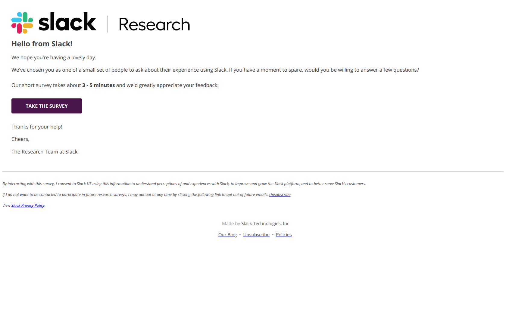 This email is a customer feedback request from Slack, inviting select users to participate in a short survey about their experience with the platform. The structure is straightforward, starting with a friendly greeting, followed by an explanation of the survey's purpose, a prominent call-to-action button to take the survey, and a polite closing. The tone is warm, appreciative, and professional, aiming to encourage user engagement without being intrusive. It includes clear consent information and unsubscribe options for compliance and user control.