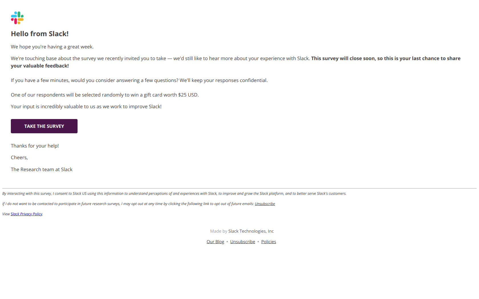 This email is a survey reminder from Slack, encouraging users to participate in a feedback survey about their experience with the platform before the survey closes. It opens with a friendly and polite tone, briefly explaining the purpose of the survey and the confidentiality of responses, and it includes a clear call-to-action button linking directly to the survey. The structure is straightforward, ending with an incentive mention, consent information, and options for privacy policy viewing and unsubscribing, maintaining a professional and respectful tone throughout.