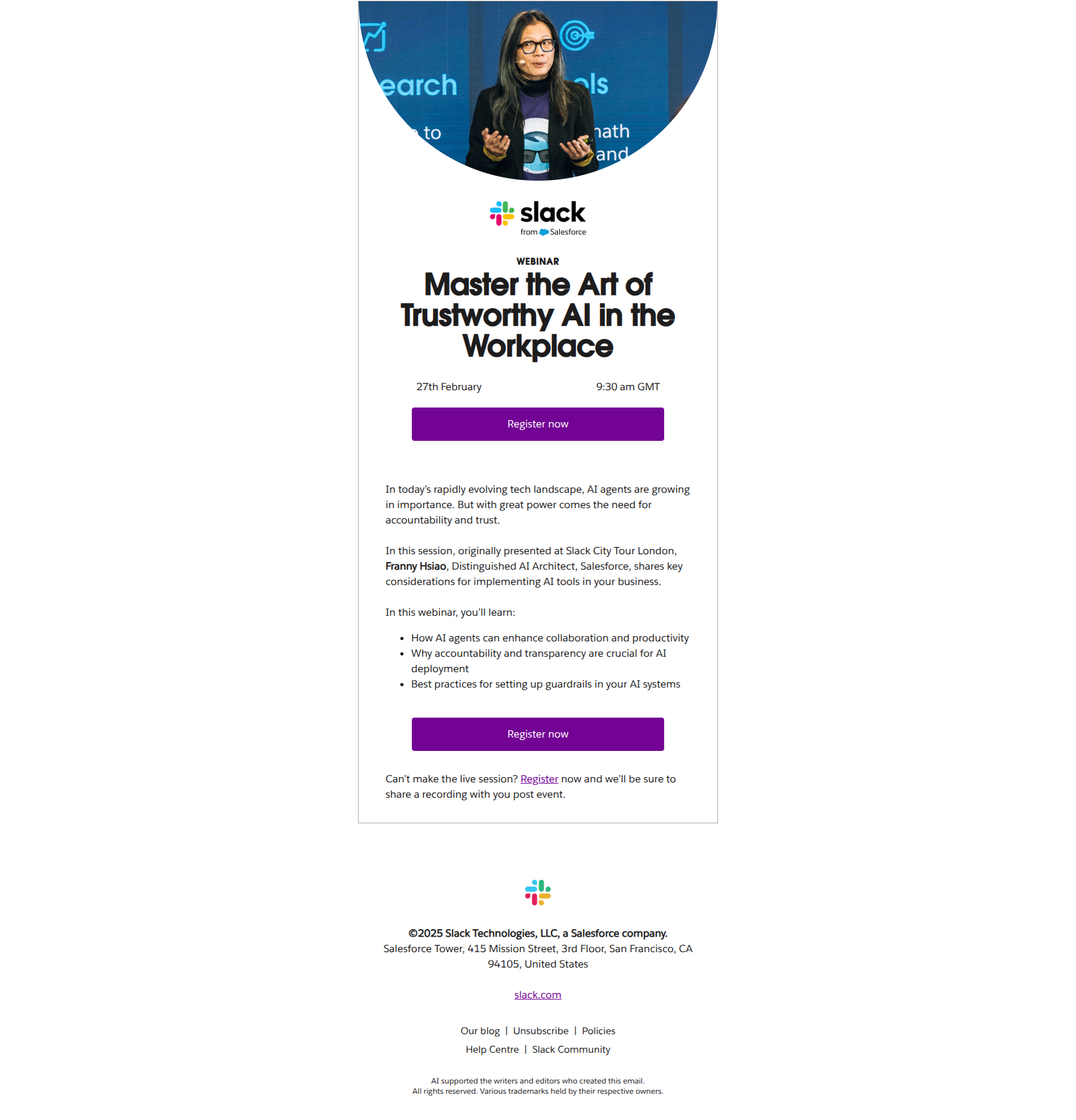 <!DOCTYPE HTML PUBLIC "-//W3C//DTD HTML 4.01 Transitional//EN" "http://www.w3.org/TR/html4/loose.dtd"> <html xmlns="http://www.w3.org/1999/xhtml" xmlns:v="urn:schemas-microsoft-com:vml" xmlns:o="urn:schemas-microsoft-com:office:office"> <!--[if gte mso 9]><xml> <o:OfficeDocumentSettings> <o:AllowPNG/> <o:PixelsPerInch>96</o:PixelsPerInch> </o:OfficeDocumentSettings> </xml><![endif]--> <head> <meta http-equiv="Content-Type" content="text/html;" charset="utf-8" /> <meta name="viewport" content="width=device-width, initial-scale=1.0" /> <!--[if !mso]><!--> <meta http-equiv="X-UA-Compatible" content="IE=edge" /> <!--<![endif]--> <link href="https://fonts.googleapis.com/css?family=Open+Sans" rel="stylesheet"> <!-- Begin Knak Styles. Added 9/16/2021 --> <style type="text/css"> #outlook a { padding:0; } body { margin:0; padding:0; -webkit-text-size-adjust:100%; -ms-text-size-adjust:100%; } table { border-spacing:0; } img { border:0; height:auto; line-height:100%; outline:none; text-decoration:none; -ms-interpolation-mode:bicubic; } p { display:block; margin:13px 0; } </style> <!--[if mso]> <xml> <o:OfficeDocumentSettings> <o:AllowPNG/> <o:PixelsPerInch>96</o:PixelsPerInch> </o:OfficeDocumentSettings> </xml> <style type="text/css"> table { border-collapse:collapse; mso-table-lspace:0pt; mso-table-rspace:0pt; } .mj-outlook-group-fix { width:100% !important; } .block-grid-outlook .button-container a { background: transparent !important; } </style> <![endif]--> <style type="text/css"> @media only screen and (min-width:620px) { .mj-column-per-100 { width:100% !important; max-width: 100%; } .mj-column-per-60 { width:60% !important; max-width: 60%; } .mj-column-per-40 { width:40% !important; max-width: 40%; } .mj-column-per-50 { width:50% !important; max-width: 50%; } .mj-column-per-17 { width:17% !important; max-width: 17%; } .mj-column-per-83 { width:83% !important; max-width: 83%; } } </style> <style type="text/css"> @media only screen and (max-width:620px) { table.mj-full-width-mobile { width: 100% !important; } td.mj-full-width-mobile { width: auto !important; } } </style> <style type="text/css"> ul { display: block; } ul li { list-style: disc; } li li { list-style: circle; } .image-highlight{ transition: 0.3s; } .image-highlight:hover { filter: brightness(1.2); } .button-highlight{ transition: 0.3s; } .button-highlight:hover { filter: brightness(1.5); } @media only screen and (min-width: 620px) { .hide-on-mobile { display: block !important; } } @media only screen and (max-width: 620px) { .hide-on-mobile { display: none !important; } .hide-on-desktop { display: block !important; max-height: none !important; } .hide-on-desktop td { display: table-cell !important; max-height: none !important; } } .hide-on-desktop, .hide-on-desktop td { mso-hide: all; display: none; max-height: 0px; overflow: hidden; } </style> <!-- End Knak Styles --> <!-- Begin Slack Omni Styles --> <style type="text/css"> @font-face{font-family:'SalesforceSansBold';src:url('https://c1.sfdcstatic.com/etc/clientlibs/sfdc-aem-master/clientlibs_base/fonts/SalesforceSans-Bold.eot');src:url('https://c1.sfdcstatic.com/etc/clientlibs/sfdc-aem-master/clientlibs_base/fonts/SalesforceSans-Bold.eot?#iefix') format('embedded-opentype'),url('https://c1.sfdcstatic.com/etc/clientlibs/sfdc-aem-master/clientlibs_base/fonts/SalesforceSans-Bold.woff') format('woff'),url('https://c1.sfdcstatic.com/etc/clientlibs/sfdc-aem-master/clientlibs_base/fonts/SalesforceSans-Bold.woff2') format('woff2'),url('https://c1.sfdcstatic.com/etc/clientlibs/sfdc-aem-master/clientlibs_base/fonts/SalesforceSans-Bold.ttf') format('truetype'),url('https://c1.sfdcstatic.com/etc/clientlibs/sfdc-aem-master/clientlibs_base/fonts/SalesforceSans-Bold.svg#SalesforceSansBold') format('svg');font-weight:normal;font-style:normal} @font-face{font-family:'SalesforceSansRegular';src:url('https://c1.sfdcstatic.com/etc/clientlibs/sfdc-aem-master/clientlibs_base/fonts/SalesforceSans-Regular.eot');src:url('https://c1.sfdcstatic.com/etc/clientlibs/sfdc-aem-master/clientlibs_base/fonts/SalesforceSans-Regular.eot?#iefix') format('embedded-opentype'),url('https://c1.sfdcstatic.com/etc/clientlibs/sfdc-aem-master/clientlibs_base/fonts/SalesforceSans-Regular.woff') format('woff'),url('https://c1.sfdcstatic.com/etc/clientlibs/sfdc-aem-master/clientlibs_base/fonts/SalesforceSans-Regular.woff2') format('woff2'),url('https://c1.sfdcstatic.com/etc/clientlibs/sfdc-aem-master/clientlibs_base/fonts/SalesforceSans-Regular.ttf') format('truetype'),url('https://c1.sfdcstatic.com/etc/clientlibs/sfdc-aem-master/clientlibs_base/fonts/SalesforceSans-Regular.svg#SalesforceSansRegular') format('svg');font-weight:normal;font-style:normal} @font-face{font-family:ITC Avant Garde;src:url(https://a.sfdcstatic.com/shared/fonts/avant-garde/AvantGardeForSalesforceW05-Dm.woff2) format("woff2"),url(https://a.sfdcstatic.com/shared/fonts/avant-garde/AvantGardeForSalesforceW05-Dm.woff) format("woff");font-weight:100;font-style:normal;font-display:swap} .ReadMsgBody { width: 100%; } /* Forces Hotmail to display emails at full width */ .ExternalClass { width: 100%; } /* Hotmail table centering fix */ .ExternalClass, .ExternalClass p, .ExternalClass span, .ExternalClass font, .ExternalClass td, .ExternalClass div { line-height: 100%; } /* Forces Hotmail to display normal line spacing */ .ExternalClass * { line-height: 100% } p { margin: 1em 0; } /* Yahoo paragraph fix */ table td { border-collapse: collapse; } /* This resolves the Outlook 07, 10, and Gmail td padding issue fix */ /* This resolves the issue when iphone puts links on dates, etc. */ .appleLinksWhite a { color: #ffffff; text-decoration: none; } .appleLinksWhiteUL a { color: #ffffff; text-decoration: underline; } .appleLinksGray a { color: #1D1C1D; text-decoration: none; } .appleLinksGray2 a { color: #707070; text-decoration: none; } .appleLinksBlack a { color: #1d1d1d; text-decoration: none; } .appleLinksGreen a { color: #1a3c34 !important; } a.mobileshow, .mobilehid