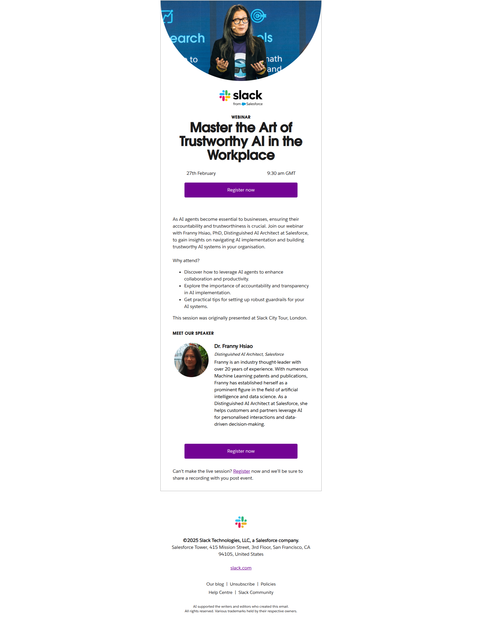 <!DOCTYPE HTML PUBLIC "-//W3C//DTD HTML 4.01 Transitional//EN" "http://www.w3.org/TR/html4/loose.dtd"> <html xmlns="http://www.w3.org/1999/xhtml" xmlns:v="urn:schemas-microsoft-com:vml" xmlns:o="urn:schemas-microsoft-com:office:office"> <!--[if gte mso 9]><xml> <o:OfficeDocumentSettings> <o:AllowPNG/> <o:PixelsPerInch>96</o:PixelsPerInch> </o:OfficeDocumentSettings> </xml><![endif]--> <head> <meta http-equiv="Content-Type" content="text/html;" charset="utf-8" /> <meta name="viewport" content="width=device-width, initial-scale=1.0" /> <!--[if !mso]><!--> <meta http-equiv="X-UA-Compatible" content="IE=edge" /> <!--<![endif]--> <link href="https://fonts.googleapis.com/css?family=Open+Sans" rel="stylesheet"> <!-- Begin Knak Styles. Added 9/16/2021 --> <style type="text/css"> #outlook a { padding:0; } body { margin:0; padding:0; -webkit-text-size-adjust:100%; -ms-text-size-adjust:100%; } table { border-spacing:0; } img { border:0; height:auto; line-height:100%; outline:none; text-decoration:none; -ms-interpolation-mode:bicubic; } p { display:block; margin:13px 0; } </style> <!--[if mso]> <xml> <o:OfficeDocumentSettings> <o:AllowPNG/> <o:PixelsPerInch>96</o:PixelsPerInch> </o:OfficeDocumentSettings> </xml> <style type="text/css"> table { border-collapse:collapse; mso-table-lspace:0pt; mso-table-rspace:0pt; } .mj-outlook-group-fix { width:100% !important; } .block-grid-outlook .button-container a { background: transparent !important; } </style> <![endif]--> <style type="text/css"> @media only screen and (min-width:620px) { .mj-column-per-100 { width:100% !important; max-width: 100%; } .mj-column-per-60 { width:60% !important; max-width: 60%; } .mj-column-per-40 { width:40% !important; max-width: 40%; } .mj-column-per-50 { width:50% !important; max-width: 50%; } .mj-column-per-17 { width:17% !important; max-width: 17%; } .mj-column-per-83 { width:83% !important; max-width: 83%; } } </style> <style type="text/css"> @media only screen and (max-width:620px) { table.mj-full-width-mobile { width: 100% !important; } td.mj-full-width-mobile { width: auto !important; } } </style> <style type="text/css"> ul { display: block; } ul li { list-style: disc; } li li { list-style: circle; } .image-highlight{ transition: 0.3s; } .image-highlight:hover { filter: brightness(1.2); } .button-highlight{ transition: 0.3s; } .button-highlight:hover { filter: brightness(1.5); } @media only screen and (min-width: 620px) { .hide-on-mobile { display: block !important; } } @media only screen and (max-width: 620px) { .hide-on-mobile { display: none !important; } .hide-on-desktop { display: block !important; max-height: none !important; } .hide-on-desktop td { display: table-cell !important; max-height: none !important; } } .hide-on-desktop, .hide-on-desktop td { mso-hide: all; display: none; max-height: 0px; overflow: hidden; } </style> <!-- End Knak Styles --> <!-- Begin Slack Omni Styles --> <style type="text/css"> @font-face{font-family:'SalesforceSansBold';src:url('https://c1.sfdcstatic.com/etc/clientlibs/sfdc-aem-master/clientlibs_base/fonts/SalesforceSans-Bold.eot');src:url('https://c1.sfdcstatic.com/etc/clientlibs/sfdc-aem-master/clientlibs_base/fonts/SalesforceSans-Bold.eot?#iefix') format('embedded-opentype'),url('https://c1.sfdcstatic.com/etc/clientlibs/sfdc-aem-master/clientlibs_base/fonts/SalesforceSans-Bold.woff') format('woff'),url('https://c1.sfdcstatic.com/etc/clientlibs/sfdc-aem-master/clientlibs_base/fonts/SalesforceSans-Bold.woff2') format('woff2'),url('https://c1.sfdcstatic.com/etc/clientlibs/sfdc-aem-master/clientlibs_base/fonts/SalesforceSans-Bold.ttf') format('truetype'),url('https://c1.sfdcstatic.com/etc/clientlibs/sfdc-aem-master/clientlibs_base/fonts/SalesforceSans-Bold.svg#SalesforceSansBold') format('svg');font-weight:normal;font-style:normal} @font-face{font-family:'SalesforceSansRegular';src:url('https://c1.sfdcstatic.com/etc/clientlibs/sfdc-aem-master/clientlibs_base/fonts/SalesforceSans-Regular.eot');src:url('https://c1.sfdcstatic.com/etc/clientlibs/sfdc-aem-master/clientlibs_base/fonts/SalesforceSans-Regular.eot?#iefix') format('embedded-opentype'),url('https://c1.sfdcstatic.com/etc/clientlibs/sfdc-aem-master/clientlibs_base/fonts/SalesforceSans-Regular.woff') format('woff'),url('https://c1.sfdcstatic.com/etc/clientlibs/sfdc-aem-master/clientlibs_base/fonts/SalesforceSans-Regular.woff2') format('woff2'),url('https://c1.sfdcstatic.com/etc/clientlibs/sfdc-aem-master/clientlibs_base/fonts/SalesforceSans-Regular.ttf') format('truetype'),url('https://c1.sfdcstatic.com/etc/clientlibs/sfdc-aem-master/clientlibs_base/fonts/SalesforceSans-Regular.svg#SalesforceSansRegular') format('svg');font-weight:normal;font-style:normal} @font-face{font-family:ITC Avant Garde;src:url(https://a.sfdcstatic.com/shared/fonts/avant-garde/AvantGardeForSalesforceW05-Dm.woff2) format("woff2"),url(https://a.sfdcstatic.com/shared/fonts/avant-garde/AvantGardeForSalesforceW05-Dm.woff) format("woff");font-weight:100;font-style:normal;font-display:swap} .ReadMsgBody { width: 100%; } /* Forces Hotmail to display emails at full width */ .ExternalClass { width: 100%; } /* Hotmail table centering fix */ .ExternalClass, .ExternalClass p, .ExternalClass span, .ExternalClass font, .ExternalClass td, .ExternalClass div { line-height: 100%; } /* Forces Hotmail to display normal line spacing */ .ExternalClass * { line-height: 100% } p { margin: 1em 0; } /* Yahoo paragraph fix */ table td { border-collapse: collapse; } /* This resolves the Outlook 07, 10, and Gmail td padding issue fix */ /* This resolves the issue when iphone puts links on dates, etc. */ .appleLinksWhite a { color: #ffffff; text-decoration: none; } .appleLinksWhiteUL a { color: #ffffff; text-decoration: underline; } .appleLinksGray a { color: #1D1C1D; text-decoration: none; } .appleLinksGray2 a { color: #707070; text-decoration: none; } .appleLinksBlack a { color: #1d1d1d; text-decoration: none; } .appleLinksGreen a { color: #1a3c34 !important; } a.mobileshow, .mobilehid