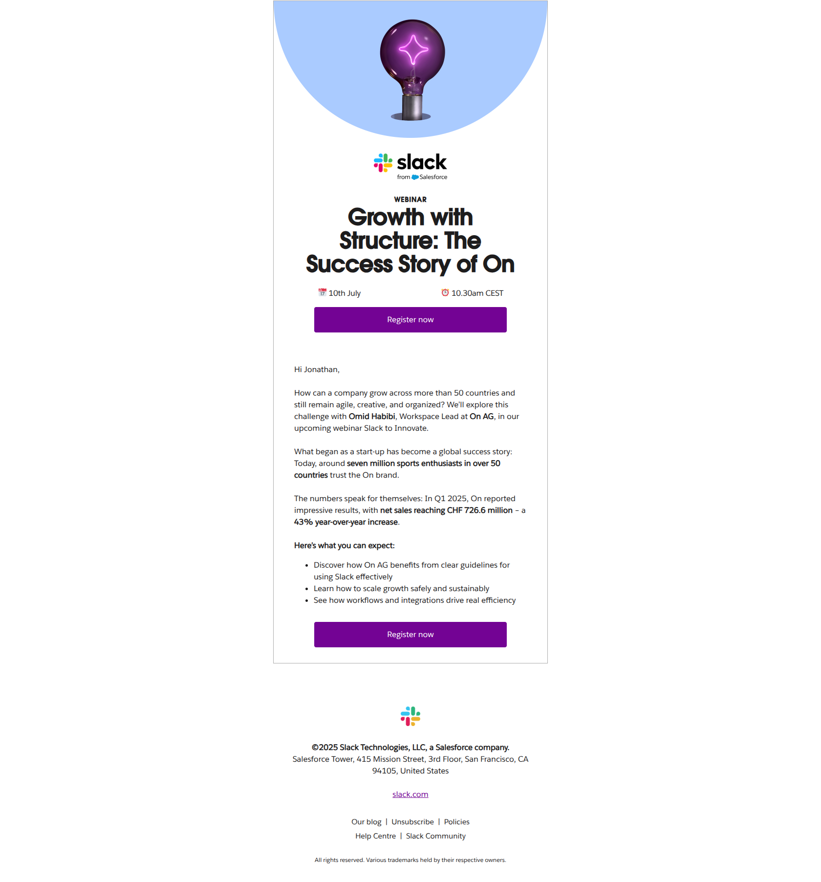 <!DOCTYPE HTML PUBLIC "-//W3C//DTD HTML 4.01 Transitional//EN" "http://www.w3.org/TR/html4/loose.dtd"> <html xmlns="http://www.w3.org/1999/xhtml" xmlns:v="urn:schemas-microsoft-com:vml" xmlns:o="urn:schemas-microsoft-com:office:office"> <!--[if gte mso 9]><xml> <o:OfficeDocumentSettings> <o:AllowPNG/> <o:PixelsPerInch>96</o:PixelsPerInch> </o:OfficeDocumentSettings> </xml><![endif]--> <head> <meta http-equiv="Content-Type" content="text/html;" charset="utf-8" /> <meta name="viewport" content="width=device-width, initial-scale=1.0" /> <!--[if !mso]><!--> <meta http-equiv="X-UA-Compatible" content="IE=edge" /> <!--<![endif]--> <link href="https://fonts.googleapis.com/css?family=Open+Sans" rel="stylesheet"> <!-- Begin Knak Styles. Added 9/16/2021 --> <style type="text/css"> #outlook a { padding:0; } body { margin:0; padding:0; -webkit-text-size-adjust:100%; -ms-text-size-adjust:100%; } table { border-spacing:0; } img { border:0; height:auto; line-height:100%; outline:none; text-decoration:none; -ms-interpolation-mode:bicubic; } p { display:block; margin:13px 0; } </style> <!--[if mso]> <xml> <o:OfficeDocumentSettings> <o:AllowPNG/> <o:PixelsPerInch>96</o:PixelsPerInch> </o:OfficeDocumentSettings> </xml> <style type="text/css"> table { border-collapse:collapse; mso-table-lspace:0pt; mso-table-rspace:0pt; } .mj-outlook-group-fix { width:100% !important; } .block-grid-outlook .button-container a { background: transparent !important; } </style> <![endif]--> <style type="text/css"> @media only screen and (min-width:620px) { .mj-column-per-100 { width:100% !important; max-width: 100%; } .mj-column-per-60 { width:60% !important; max-width: 60%; } .mj-column-per-40 { width:40% !important; max-width: 40%; } .mj-column-per-50 { width:50% !important; max-width: 50%; } .mj-column-per-17 { width:17% !important; max-width: 17%; } .mj-column-per-83 { width:83% !important; max-width: 83%; } } </style> <style type="text/css"> @media only screen and (max-width:620px) { table.mj-full-width-mobile { width: 100% !important; } td.mj-full-width-mobile { width: auto !important; } } </style> <style type="text/css"> ul { display: block; } ul li { list-style: disc; } li li { list-style: circle; } .image-highlight{ transition: 0.3s; } .image-highlight:hover { filter: brightness(1.2); } .button-highlight{ transition: 0.3s; } .button-highlight:hover { filter: brightness(1.5); } @media only screen and (min-width: 620px) { .hide-on-mobile { display: block !important; } } @media only screen and (max-width: 620px) { .hide-on-mobile { display: none !important; } .hide-on-desktop { display: block !important; max-height: none !important; } .hide-on-desktop td { display: table-cell !important; max-height: none !important; } } .hide-on-desktop, .hide-on-desktop td { mso-hide: all; display: none; max-height: 0px; overflow: hidden; } </style> <!-- End Knak Styles --> <!-- Begin Slack Omni Styles --> <style type="text/css"> @font-face{font-family:'SalesforceSansBold';src:url('https://c1.sfdcstatic.com/etc/clientlibs/sfdc-aem-master/clientlibs_base/fonts/SalesforceSans-Bold.eot');src:url('https://c1.sfdcstatic.com/etc/clientlibs/sfdc-aem-master/clientlibs_base/fonts/SalesforceSans-Bold.eot?#iefix') format('embedded-opentype'),url('https://c1.sfdcstatic.com/etc/clientlibs/sfdc-aem-master/clientlibs_base/fonts/SalesforceSans-Bold.woff') format('woff'),url('https://c1.sfdcstatic.com/etc/clientlibs/sfdc-aem-master/clientlibs_base/fonts/SalesforceSans-Bold.woff2') format('woff2'),url('https://c1.sfdcstatic.com/etc/clientlibs/sfdc-aem-master/clientlibs_base/fonts/SalesforceSans-Bold.ttf') format('truetype'),url('https://c1.sfdcstatic.com/etc/clientlibs/sfdc-aem-master/clientlibs_base/fonts/SalesforceSans-Bold.svg#SalesforceSansBold') format('svg');font-weight:normal;font-style:normal} @font-face{font-family:'SalesforceSansRegular';src:url('https://c1.sfdcstatic.com/etc/clientlibs/sfdc-aem-master/clientlibs_base/fonts/SalesforceSans-Regular.eot');src:url('https://c1.sfdcstatic.com/etc/clientlibs/sfdc-aem-master/clientlibs_base/fonts/SalesforceSans-Regular.eot?#iefix') format('embedded-opentype'),url('https://c1.sfdcstatic.com/etc/clientlibs/sfdc-aem-master/clientlibs_base/fonts/SalesforceSans-Regular.woff') format('woff'),url('https://c1.sfdcstatic.com/etc/clientlibs/sfdc-aem-master/clientlibs_base/fonts/SalesforceSans-Regular.woff2') format('woff2'),url('https://c1.sfdcstatic.com/etc/clientlibs/sfdc-aem-master/clientlibs_base/fonts/SalesforceSans-Regular.ttf') format('truetype'),url('https://c1.sfdcstatic.com/etc/clientlibs/sfdc-aem-master/clientlibs_base/fonts/SalesforceSans-Regular.svg#SalesforceSansRegular') format('svg');font-weight:normal;font-style:normal} @font-face{font-family:ITC Avant Garde;src:url(https://a.sfdcstatic.com/shared/fonts/avant-garde/AvantGardeForSalesforceW05-Dm.woff2) format("woff2"),url(https://a.sfdcstatic.com/shared/fonts/avant-garde/AvantGardeForSalesforceW05-Dm.woff) format("woff");font-weight:100;font-style:normal;font-display:swap} .ReadMsgBody { width: 100%; } /* Forces Hotmail to display emails at full width */ .ExternalClass { width: 100%; } /* Hotmail table centering fix */ .ExternalClass, .ExternalClass p, .ExternalClass span, .ExternalClass font, .ExternalClass td, .ExternalClass div { line-height: 100%; } /* Forces Hotmail to display normal line spacing */ .ExternalClass * { line-height: 100% } p { margin: 1em 0; } /* Yahoo paragraph fix */ table td { border-collapse: collapse; } /* This resolves the Outlook 07, 10, and Gmail td padding issue fix */ /* This resolves the issue when iphone puts links on dates, etc. */ .appleLinksWhite a { color: #ffffff; text-decoration: none; } .appleLinksWhiteUL a { color: #ffffff; text-decoration: underline; } .appleLinksGray a { color: #1D1C1D; text-decoration: none; } .appleLinksGray2 a { color: #707070; text-decoration: none; } .appleLinksBlack a { color: #1d1d1d; text-decoration: none; } .appleLinksGreen a { color: #1a3c34 !important; } a.mobileshow, .mobilehid